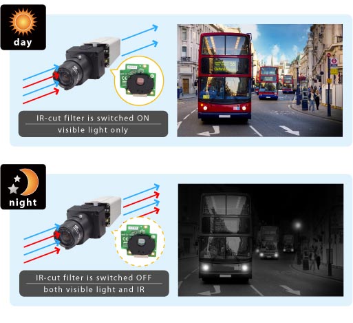توسط یک فیلتر لغزان، فیلتر IR Cut امکان تغییر مکان پیدا میکند. به صورتی که در روز میتواند در مقابل سنسور تصویر دوربین مداربسته قرار گرفته و در شب میتواند کنار رود تا دوربین مداربسته توسط پخش نور مادونقرمز در محیط امکان دید در شب را پیدا کند.
