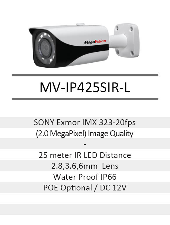 دوربین مداربسته MV-IP425SIR مگاویژن دارای چیپست سونی 323 و دو مگاپیکسلی است و بیست فریم در ثانیه تصاویر را منتقل میکند ضمن این که دارای تکنولوژی استارلایت و دارای دید در شب با برد بیست و پنج متر میباشد.