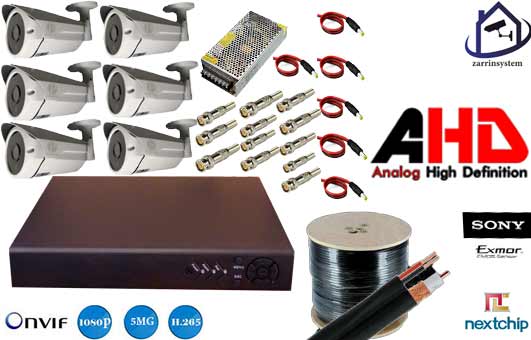 6 عدد دوربین مداربسته بولت دو مگاپیکسل – یک عدد دستگاه DVR هشت کانال پنج مگاپیگسل – 1 عدد منبع تغذیه ده امپر – 6 عدد فیش تغذیه -12 عدد فیش BNC – شصت متر کابل کواکسیال ترکیبی